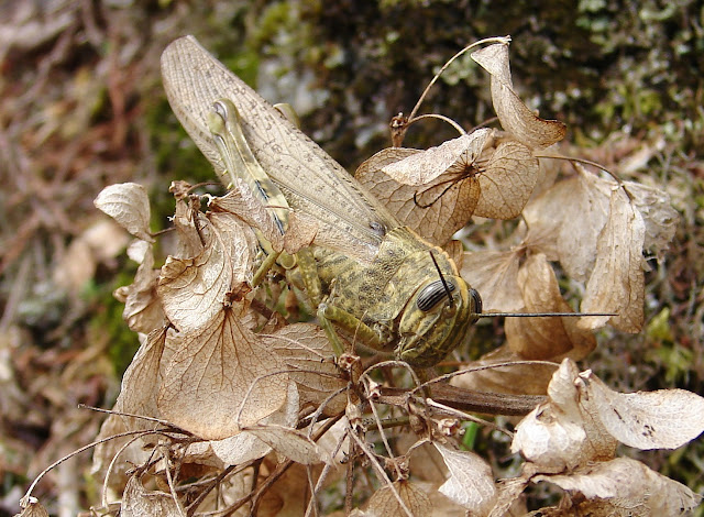 So sorry you haven't been well! Hope you mend soon. Your beautiful shots of the grasshopper in the dead hydrangeas are just wonderful!