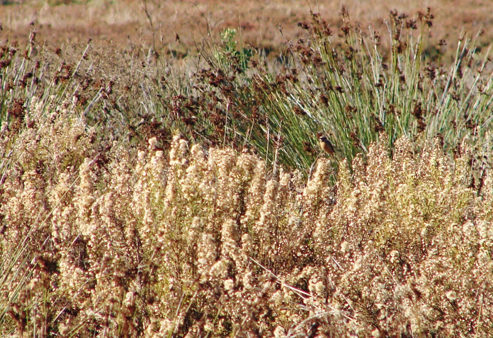 A Stonechat perched on top of the reeds. |