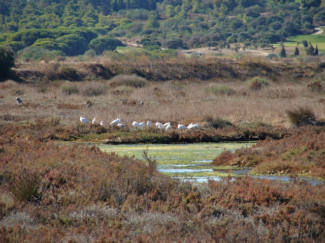 I'm not sure about the ID of these birds , perhaps young flamingos, but they were surrounded by Grey Herons, which was puzzling! |