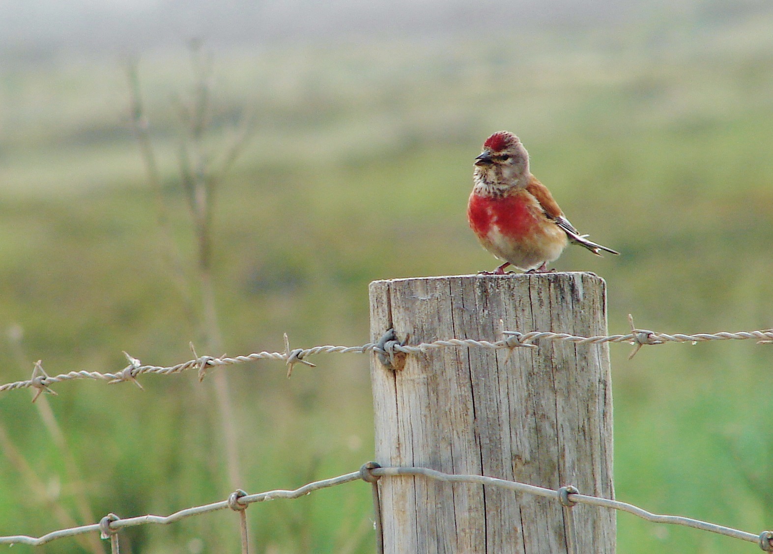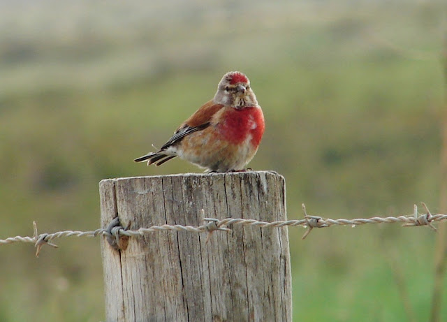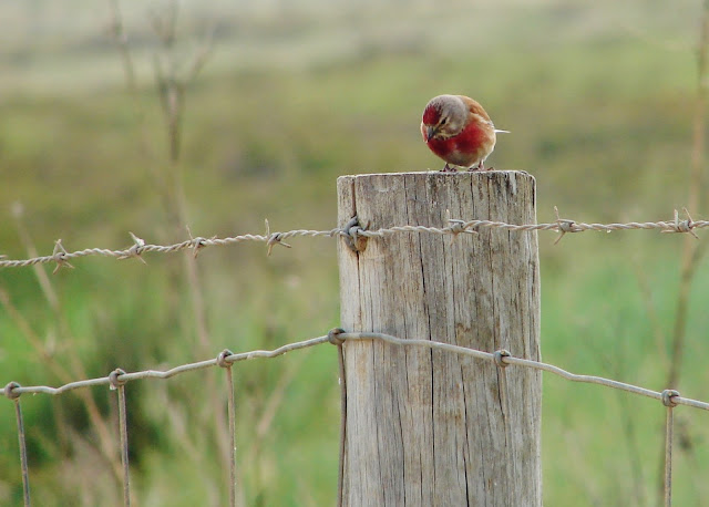 When we saw a little bird with a very red breast, on our way home, one late afternoon, we had no idea what it was, but it was so cute that I had to get as many shots as possible. I have since identified it as a male Linnet, even though the photos I looked at on Google didn't show any with such a brightly coloured breast. I do hope I'm right about the ID! The photos I'm about to share are all very similar, but I'm sure you'll agree, he's a cute little ball of fluff.
