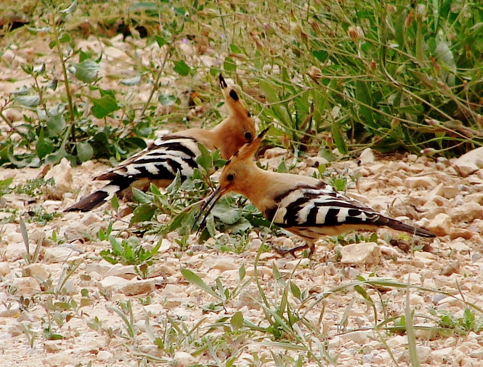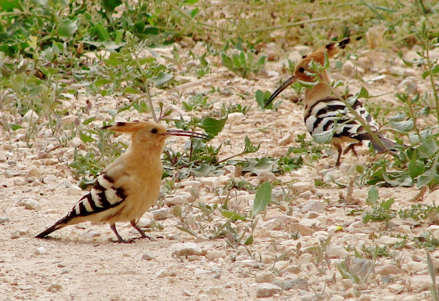 HERE, YOU CAN JUST MAKE OUT, THAT ONE HOOPOE HAS SOMETHING IN IT'S BEAK. |